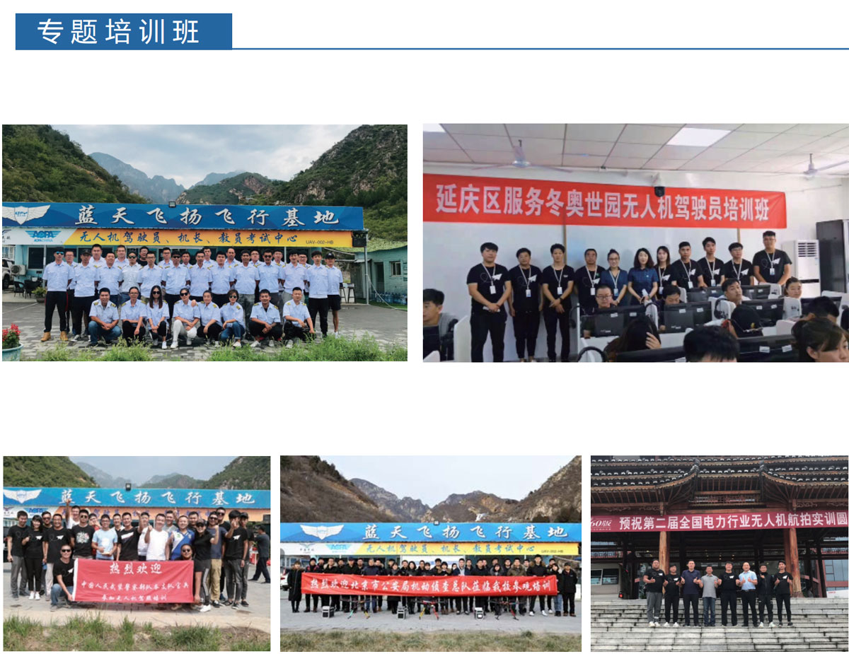 ????????2014年公司成立藍天飛揚培訓機構,成為國內首家由民航授權的無人機駕駛員、機長和教員培訓單位,是北京一家具有無人機辦學許可證的學校并同時開展 安保,安防,植保,電力巡檢,檢測,航拍,等行業應用培訓,憑借強大的師資力量、精銳的教官團隊和優美的專業飛場,被選為華北考場,承擔著北京及其周邊地區的考試服務。飛行機構位于北京市昌平區及延慶區,在北京擁有兩處低空空域,用于日常飛行訓練和航空文化交流。自成立以來,藍天飛揚培訓機構已為各類企業單位培訓了無人機飛行員數干名,已成為多家媒體及企業單位的培訓單位。目前與諸多企業單位及多個高等院校建立長期“教、學、航”戰略合作伙伴關系。