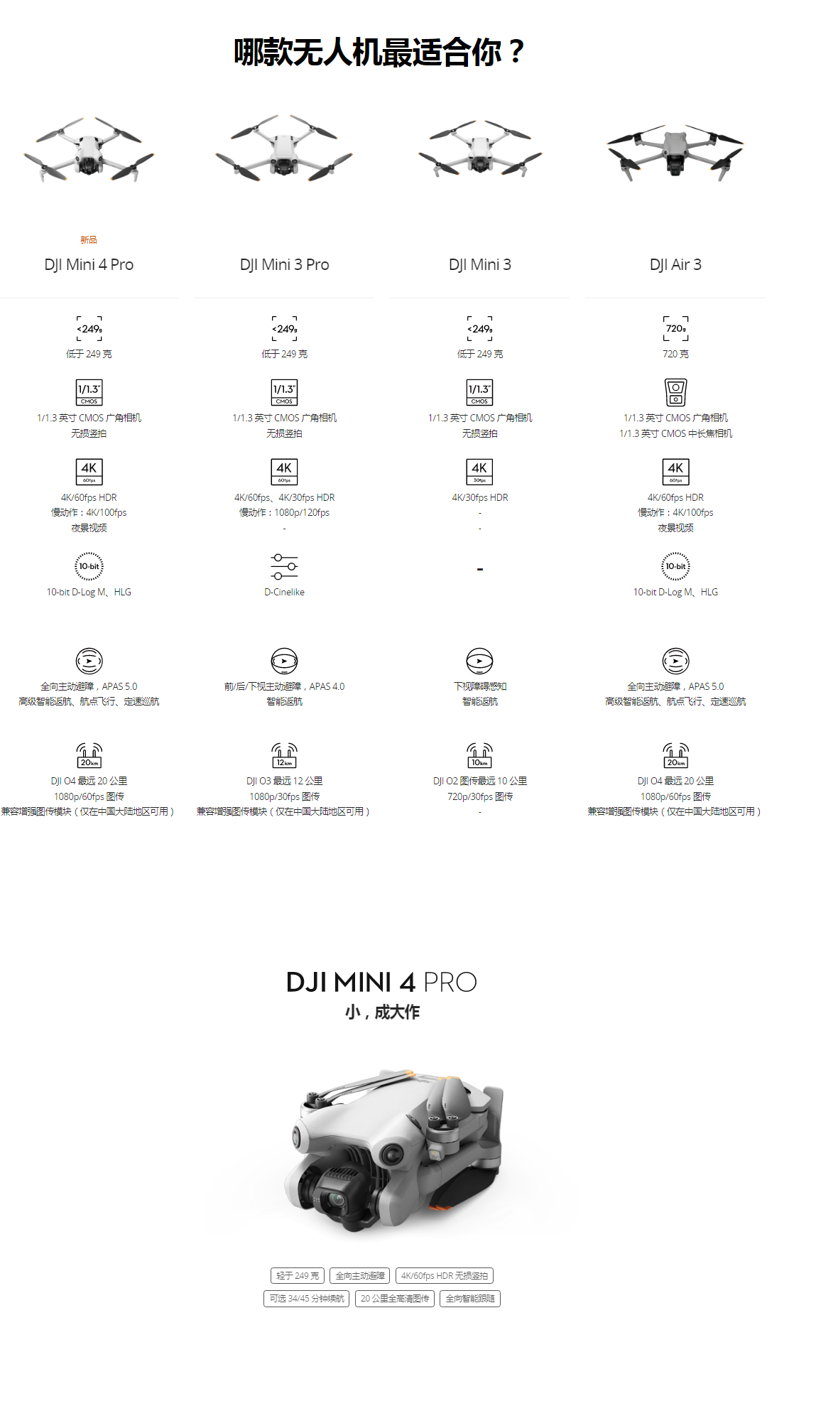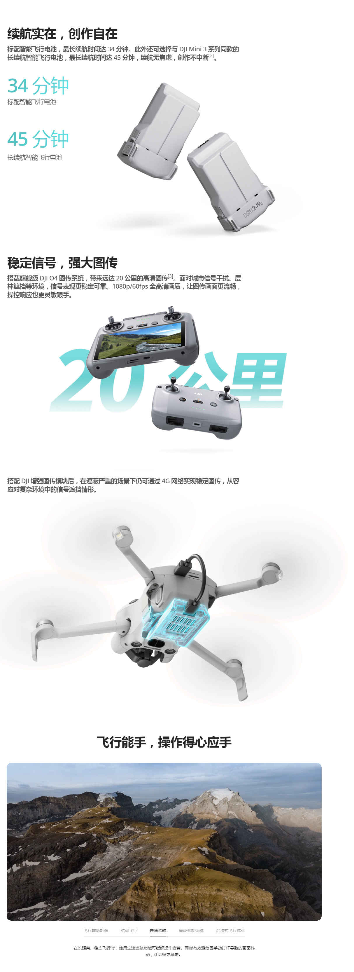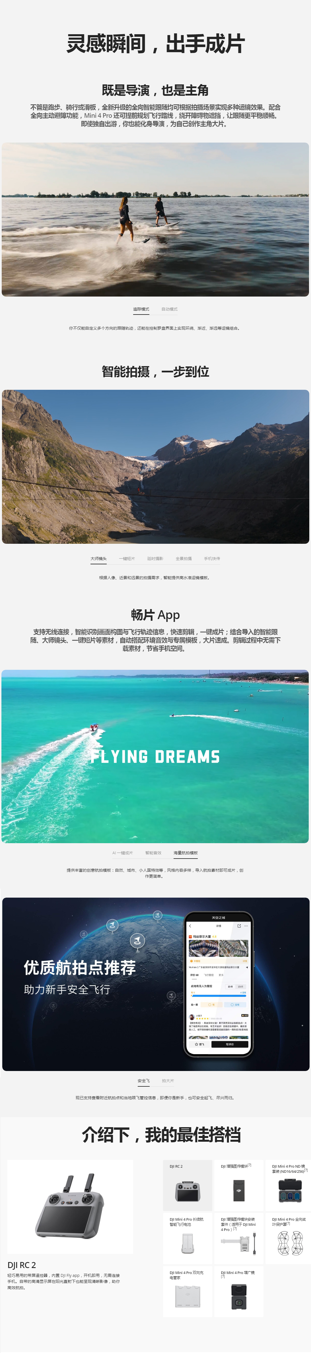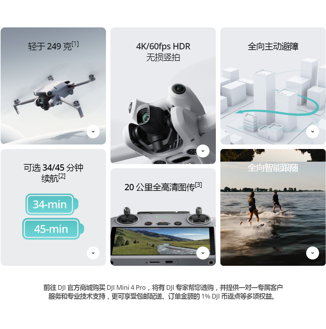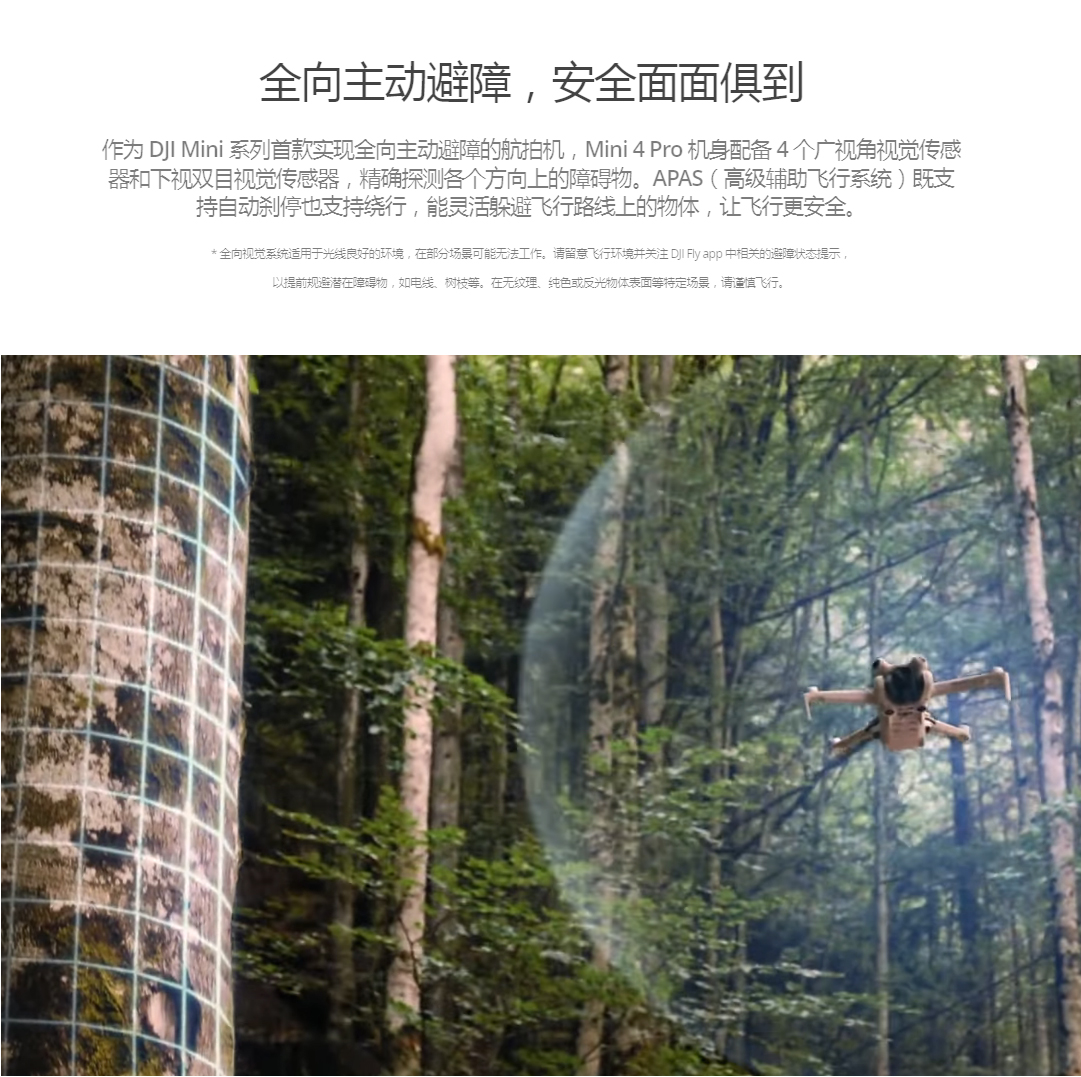 DJI Mini 4 Pro 集全面的影像實力、全向主動避障、全向智能跟隨、20 公里全高清圖傳等超凡