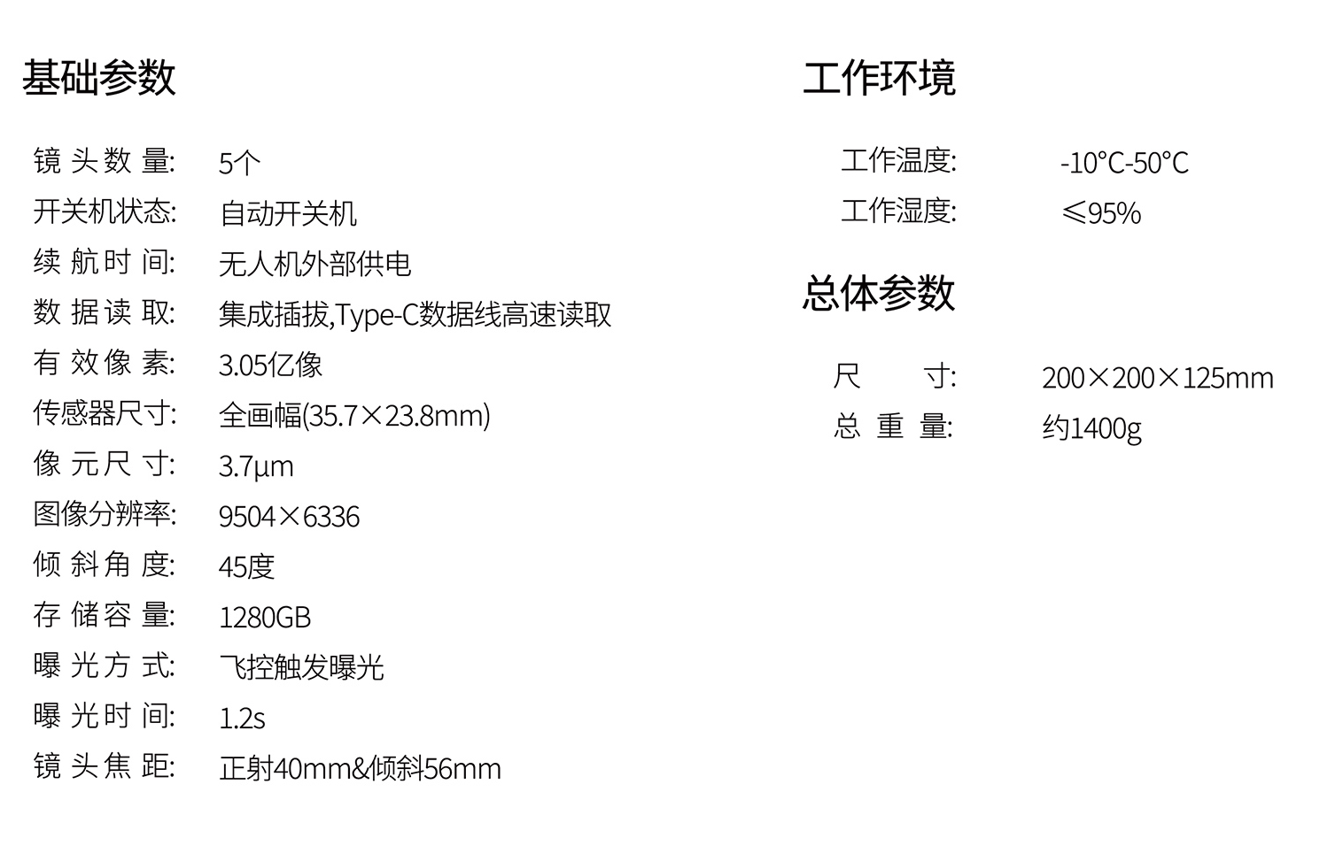 正射40mm真實大廣角焦距,打開航測新視野,超廣面積數據采集提升航片重疊率,更加精細的模型表現。 傾斜56mm仿生視野焦距,模擬人眼成像,避免航片畸變,高度還原實景,從根本上避免模型拉花,變形。
