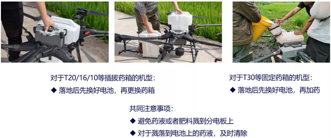 先換好電池再換藥箱或者加藥,能夠有效避免藥液或者肥料進入分電板,避免農藥及肥料對分電板的腐蝕氧化。加藥時盡量用漏斗,避免藥液浪費以及腐蝕機身、分電板、雷達。