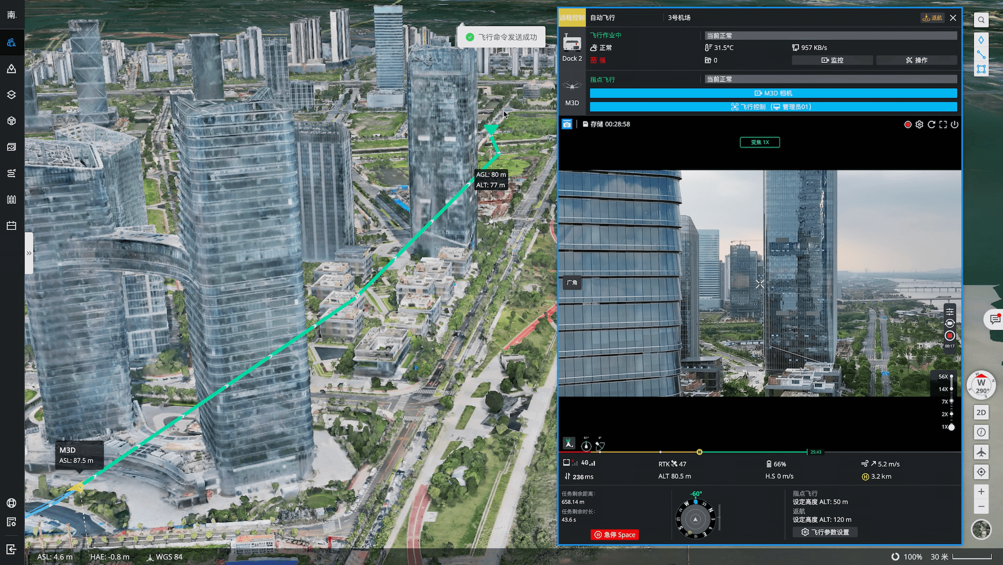 機場 2 適配大疆司空 2 云平臺,支持多種云端智能作業,實現真正的無人值守。用戶可遠程操控機場及無人機設備,快速開展航線規劃,下達飛行計劃及指令,采集多維信息。無人機在空中自動執行航線任務時,不僅支持全向避障,還可自動繞行障礙物。完成航線任務后,司空 2 根據采集的航線數據生成高精度三維模型,真實還原作業環境。借助高精度三維模型,作業人員可通過第一視角進行可視化航線編輯,預覽模擬拍攝成果,此外,通過司空 2 指點飛行功能還能為飛行器自動規劃最優航線,在緊急任務前,作業人員只需輕點目標點,飛行器就能以高效、安全的路徑飛往目的地。