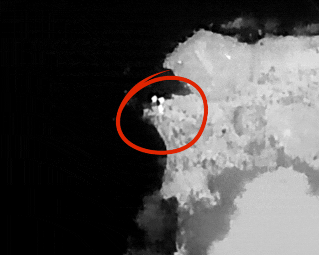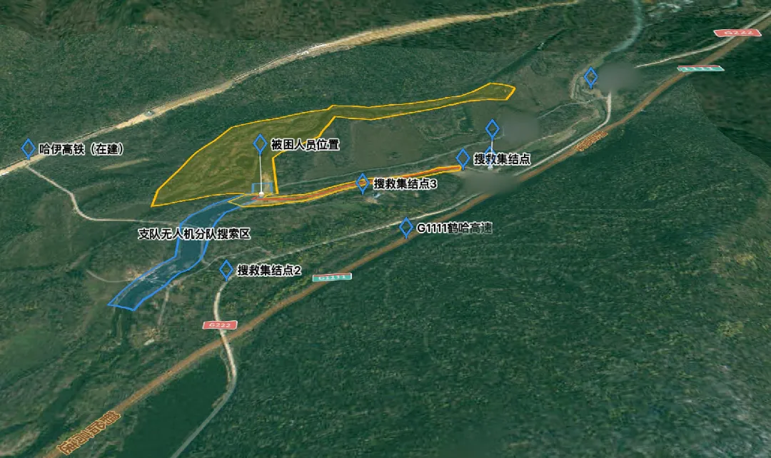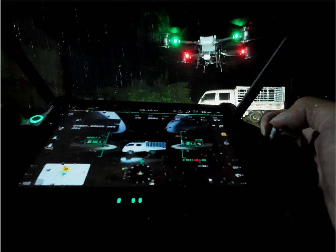 20 時 10 分,無人機熱成像畫面出現疑似熱源,救援人員立刻操作無人機抵近偵察,確認該熱源為 3 名被困人員。救援人員隨即使用無人機進行打點定位,標記受困群眾的精準位置。