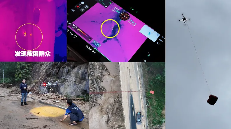 考慮到被困人員長時間缺乏補給,救援隊通過 M350 RTK 無人機掛載拋投器,向被困人員遠距離拋投救援物資。最終,在多方救援的努力下,3 名被困人員被成功救下。