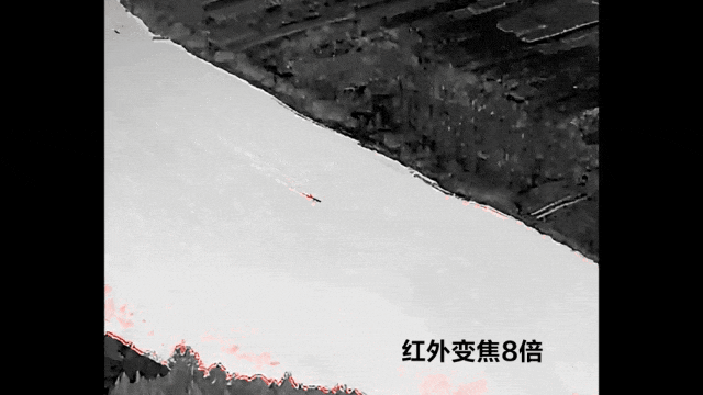 夜間視線不佳,且薄霧較多,能見度較差,執法人員切換為熱成像鏡頭進行觀察。禪思 H30T 熱成像相機分辨率高,即使在無人機飛行高度達到 400 米、距離目標物為 1200 米的情況下,依然能清晰觀測到漁船的運動軌跡和船用馬達形成的水紋,幫助執法人員快速發現并精準定位可疑情況。