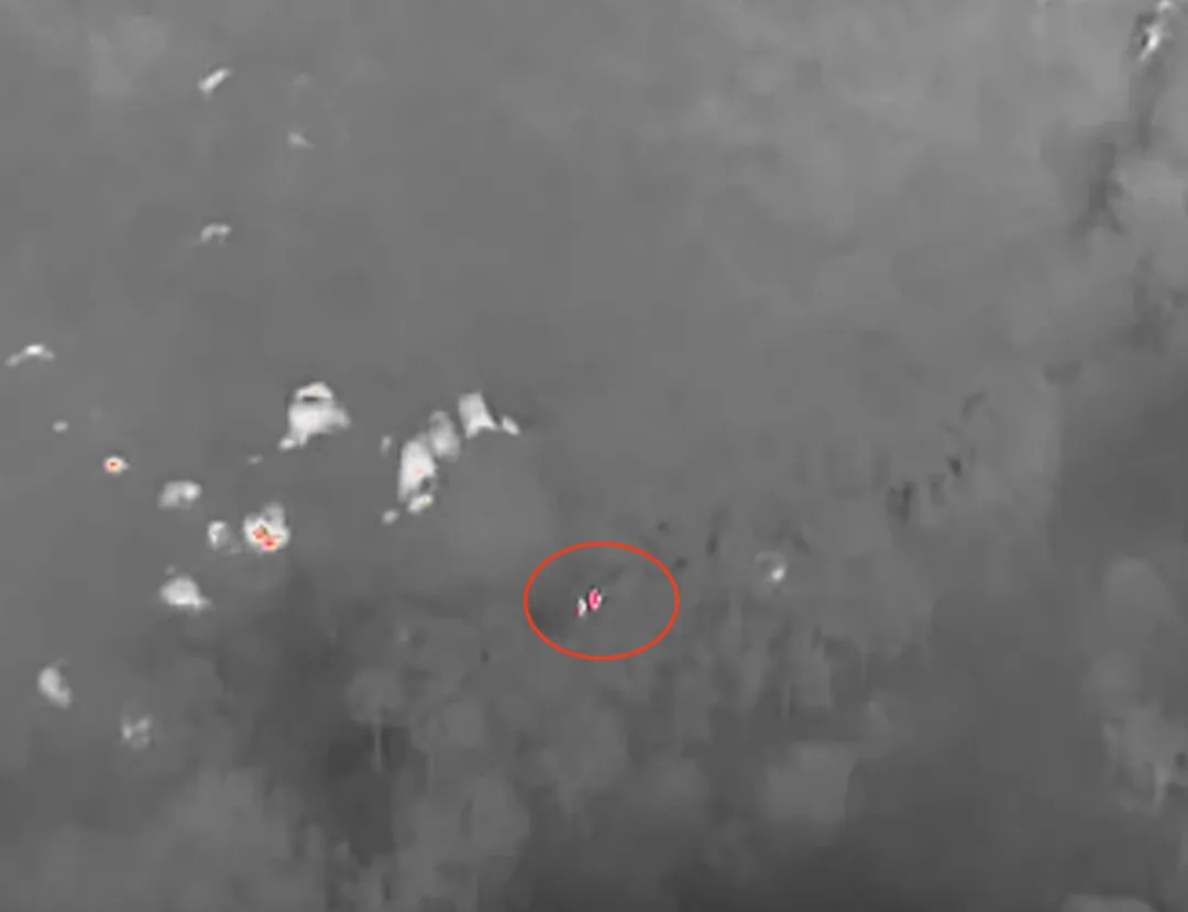 經過 20 多分鐘的搜索,熱成像鏡頭下出現了異常熱源,現場疑似有煙點。救援隊立即通過變焦相機查看細節,確認該溫度點走失男子,煙點為該男子點燃的狼煙。