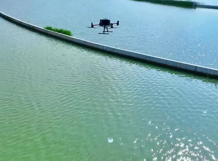 工作人員利用大疆無人機(jī)搭載水質(zhì)采樣定制功能單元,將取樣點(diǎn)設(shè)置于水面下 0.5m 處,僅用時(shí) 5 分鐘,便成功采集到湖中心水樣,實(shí)現(xiàn)水質(zhì)采樣的智能化突破。無人機(jī)載水樣采集系統(tǒng)單架次可完成 10個(gè)點(diǎn)位 1L 水樣的采集工作,相較于傳統(tǒng)人工作業(yè)效率,提升超過 10 倍。
