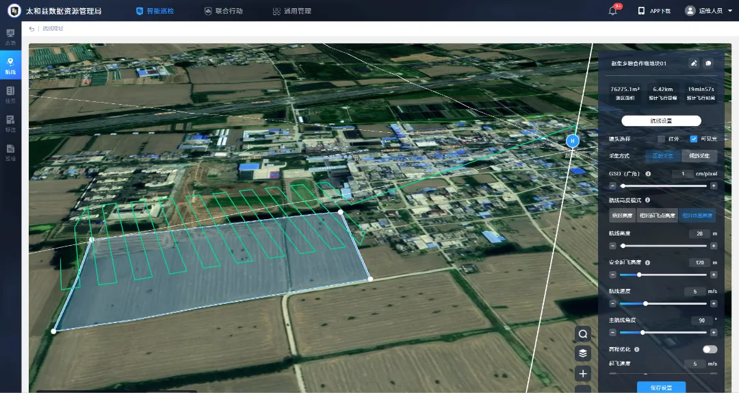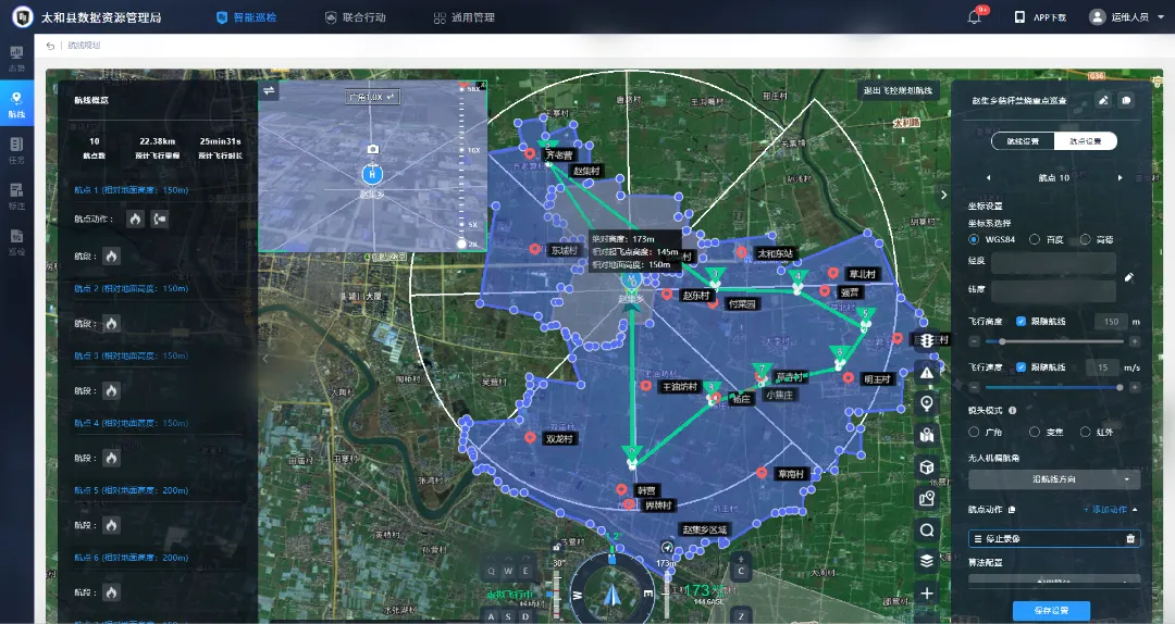引入大疆機場 2 后,工作人員為無人機規劃兩條航線任務,并開啟斷點續飛功能,對轄區內秸稈焚燒高發點位、農田主要區域開展 24 小時全時段、全自動、高頻次巡查。