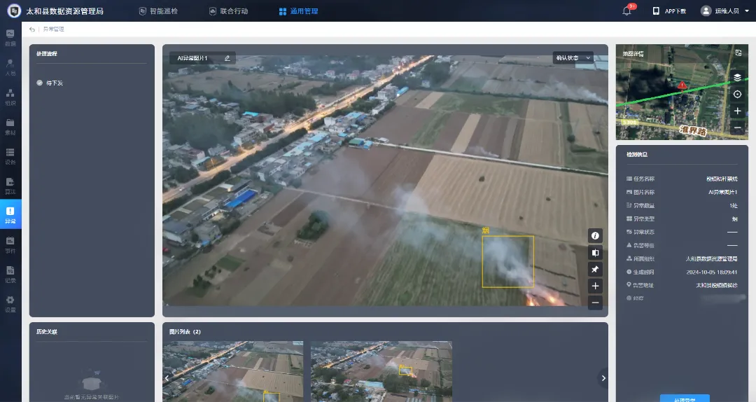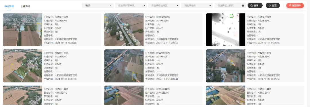 根據航線任務,無人機高空拍攝高清圖片和視頻素材,并實時傳輸畫面至后臺系統。系統通過 AI 智能識別秸稈焚燒所產生的煙霧或火光。一旦發現異常情況,系統將自動報警,并立即將地理位置等信息發送至地面人員,及時處理。