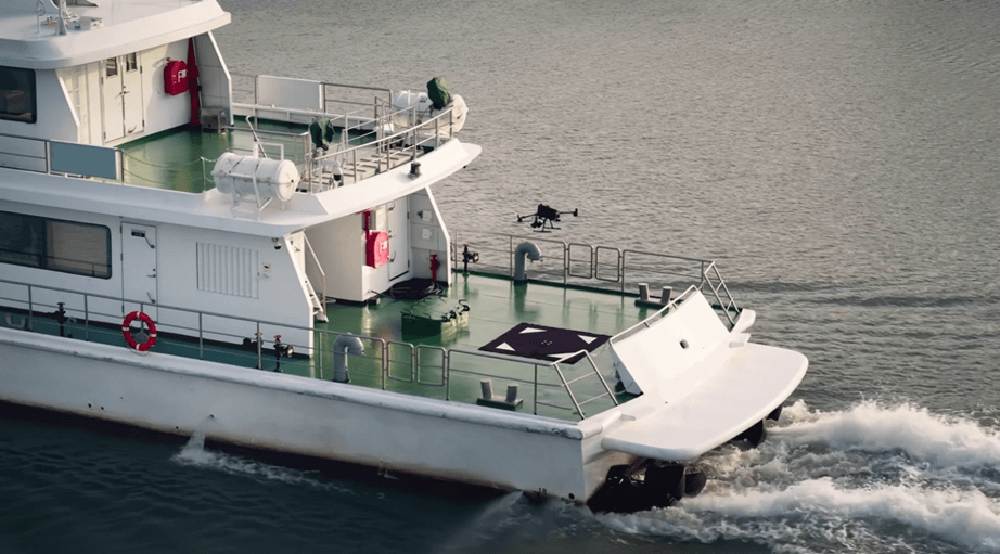 以蓬勃發展的海事領域為例,船舶巡航對于維護海洋秩序、保障海上安全至關重要。無人機憑借小巧的體積能突破地形和水域條件限制,在狹窄內河航道或復雜港口區域自由穿梭,快速抵達目標區域。空中作業的優勢加上較低的購置和運行成本,使得海事行業對無人機的需求迅猛增長,然而,甲板空間狹小、船體晃動等因素卻限制了無人機隨船使用。針對海上風機巡檢、海事巡查等水上作業需求,Matrice 400 研發團隊經過研究和測試,成功新增無人機船上起降功能,無人機通過辨認船板上的降落點圖案,可支持動態船舶降落,成功解決了船艇上無人機作業的起降難題。
