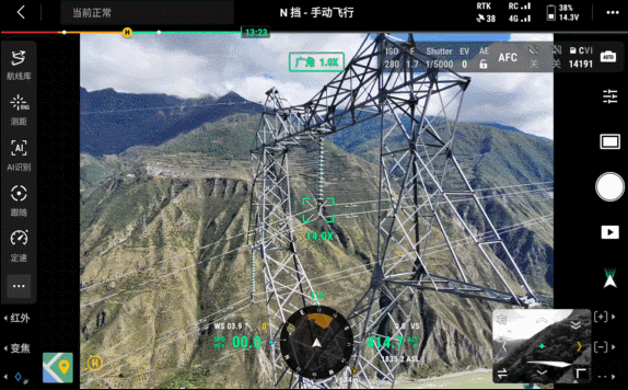 Matrice 4T 無人機配備六顆低光魚眼鏡頭,新增航線自動繞障功能。實測中,對于鐵塔目標,無人機可自動識別塔體、絕緣子等障礙物,并動態調整航線,繞開障礙物后繼續執行任務,有效降低碰撞風險。